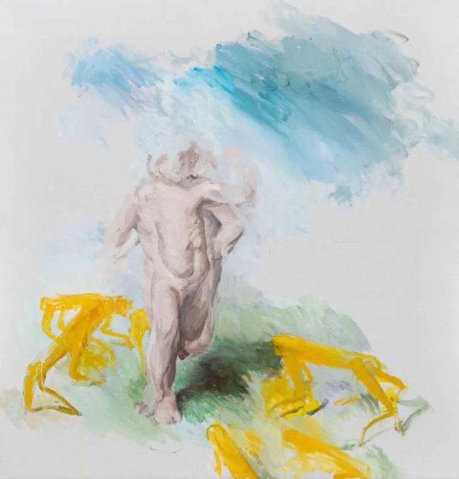 同前几年相比,司博闻的近作更为纯粹,或者换句话说,它们所承载的内容更单纯并贴近于现实本身,而其思考的深度并未缩减。画面中仍然是匿名的身体,但之前的那种如同神话隐喻或梦境般的宏大叙事被艺术家逐步拆解,被取而代之的是对某一动作的多维度呈现,他们分别来自艺术家经历的日常场景或浏览的新闻图片。他的创作更加贴近福柯笔下的异托邦世界,敞开一条通往存在本体的道路。故事性在他的近作中消失了,我们看到了如同生活潜影的图像依次出场,它们被艺术家主体的潜意识接收、打碎、转译,最终被移植到画面之上。
